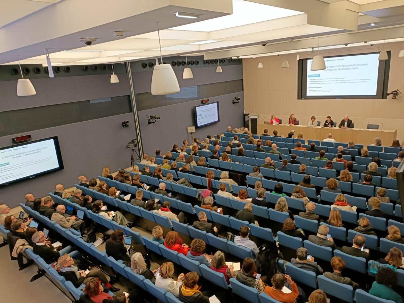 Ensuite, nous avons enchainé sur la première table ronde sur la thématique du travail, « La médiation pour sortir des conflits au travail et penser les transformations ». Les témoignages riches et authentiques de nos intervenants, Eric HUREL, DRH au Groupe RECORDATI, Joëlle ROMEO VIDONI, Responsable service clients te déléguée syndicale chez SIGNIFY FRANCE, Stéphanie SALEN, Responsable de la médiation interne au sein de la DGFIP, ont souligné un point clé : le conflit, lorsqu’il est bien géré, peut devenir une opportunité de transformation positive.