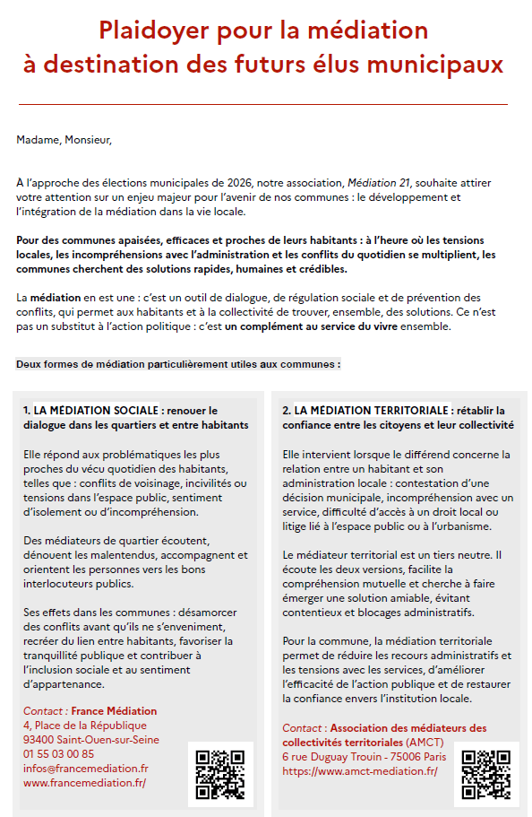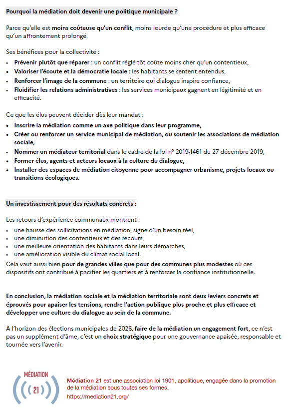 Plaidoyer pour la médiation Publié parMEDIATION 2118 mars 2026Publié dansNon classé à destination des futurs élus municipaux – mars 2026 Partager : Partager sur Facebook(ouvre dans une nouvelle fenêtre) Facebook Envoyer un lien par e-mail à un ami(ouvre dans une nouvelle fenêtre) E-mail Partager sur LinkedIn(ouvre dans une nouvelle fenêtre) LinkedIn Partager sur WhatsApp(ouvre dans une nouvelle fenêtre) WhatsApp J’aime chargement… Similaire