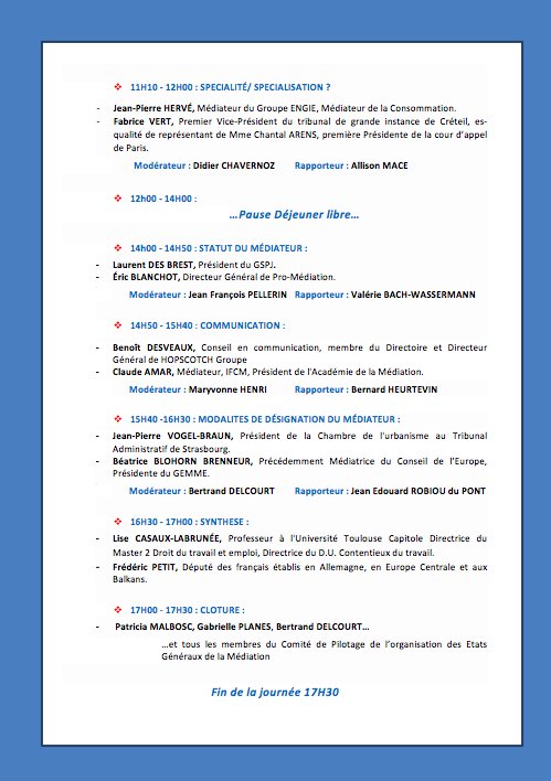 C’est sur le fondement de ces propositions que les États Généraux de la Médiation se sont tenus à l’Assemblée Nationale, le 15 juin 2018, en présence de plus de 300 médiateurs, magistrats et prescripteurs de médiation. Les propositions ont été présentées au cours d’une séance plénière à laquelle ont participé des grands témoins issus de l’univers de la médiation, des corps constitués, du monde universitaire et de la société civile, afin d’enrichir la discussion.